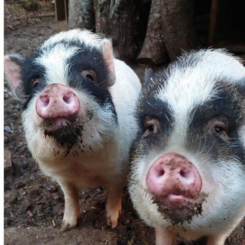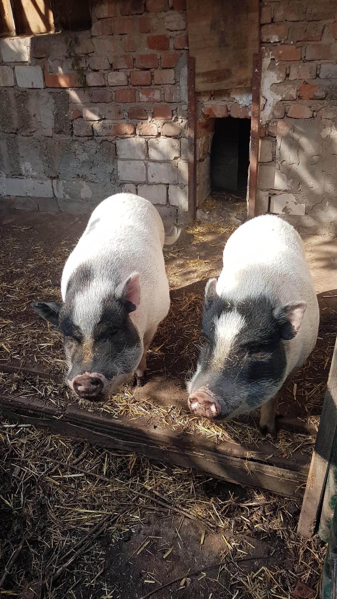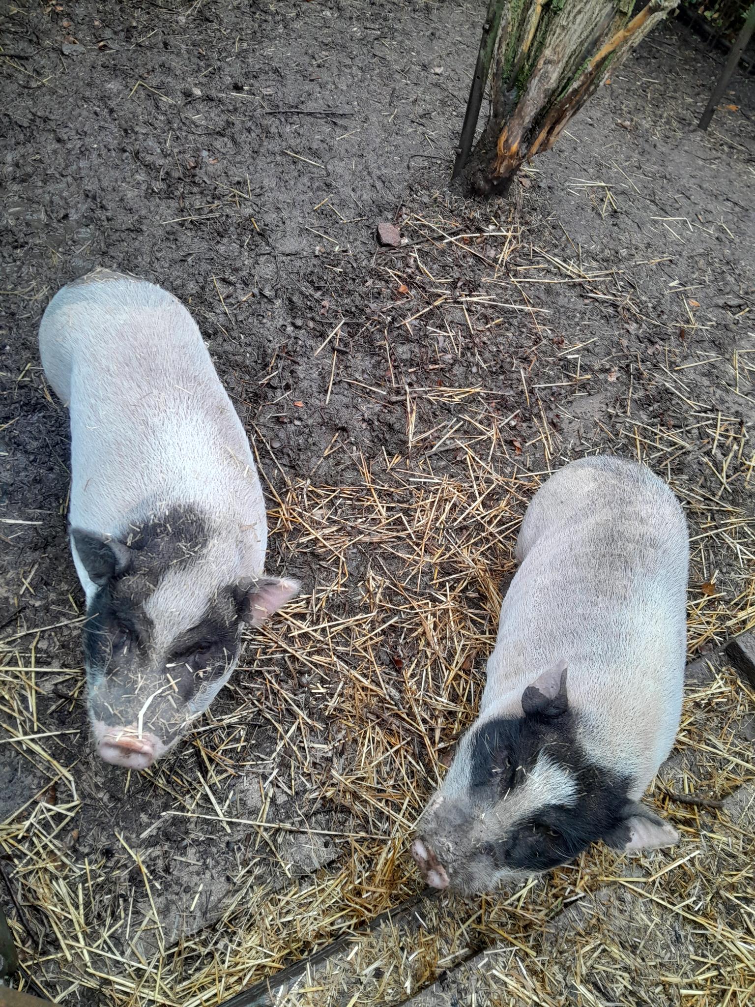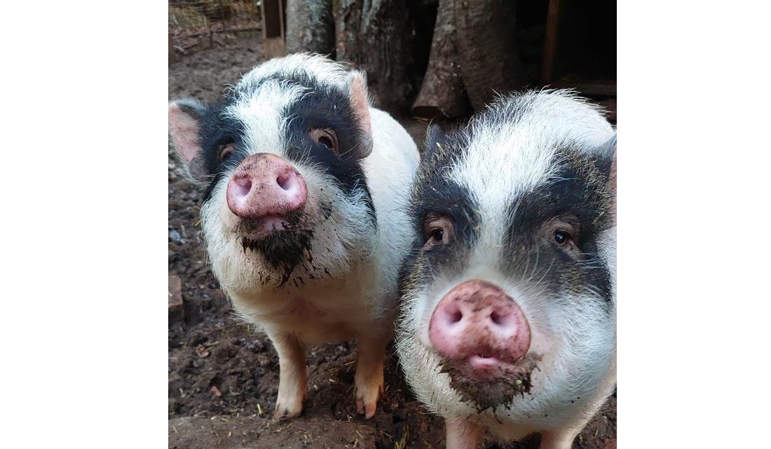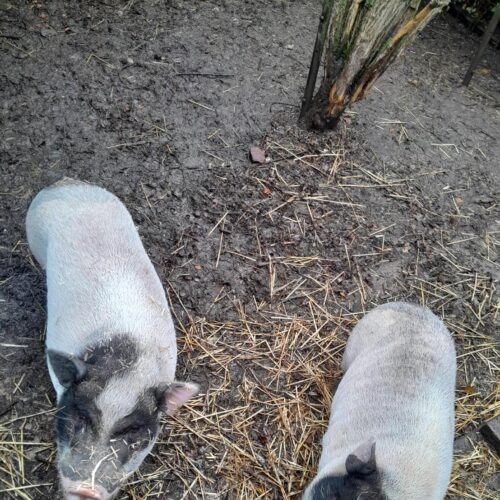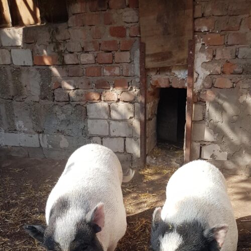 Die beiden Minischweine heißen Piggeldi und Frederick, sind ca. 5 1/2 Jahre alt und haben schwarz-weißes Fell. Beide sind typische Vertreter ihrer Art und lieben es gemütlich in der Sonne zu liegen oder etwas den Untergrund umzupflügen. Der Größere (Frederick) ist etwas dominanter und braucht wahrscheinlich etwas länger um sich an eine neue Umgebung zu gewöhnen. Aktuell leben die beiden auf einem alten Bauernhofgelände in einem Gehege inkl. altem Hühnerstall als Übernachtungsort.