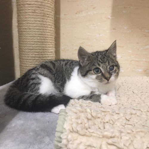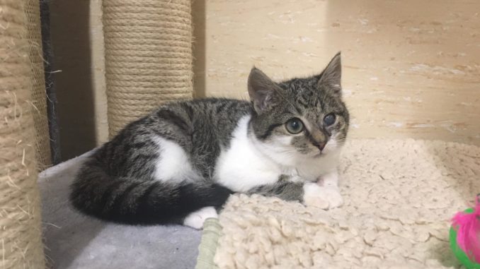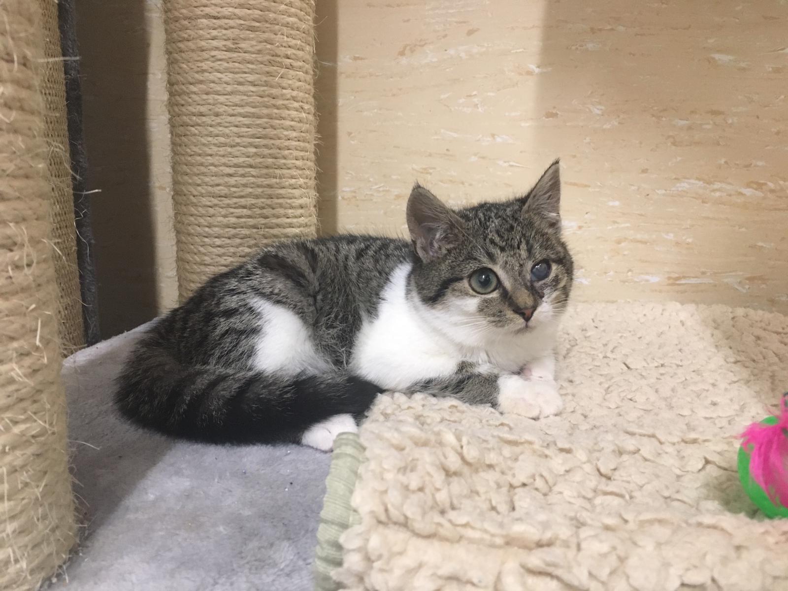 Blindi, ca 10 Wochen alt. Weiblich. Verschmust. Auf einem Auge ist die Hornhaut defekt. Keine gesundheitlichen Probleme, lediglich ein Schönheitsfehler