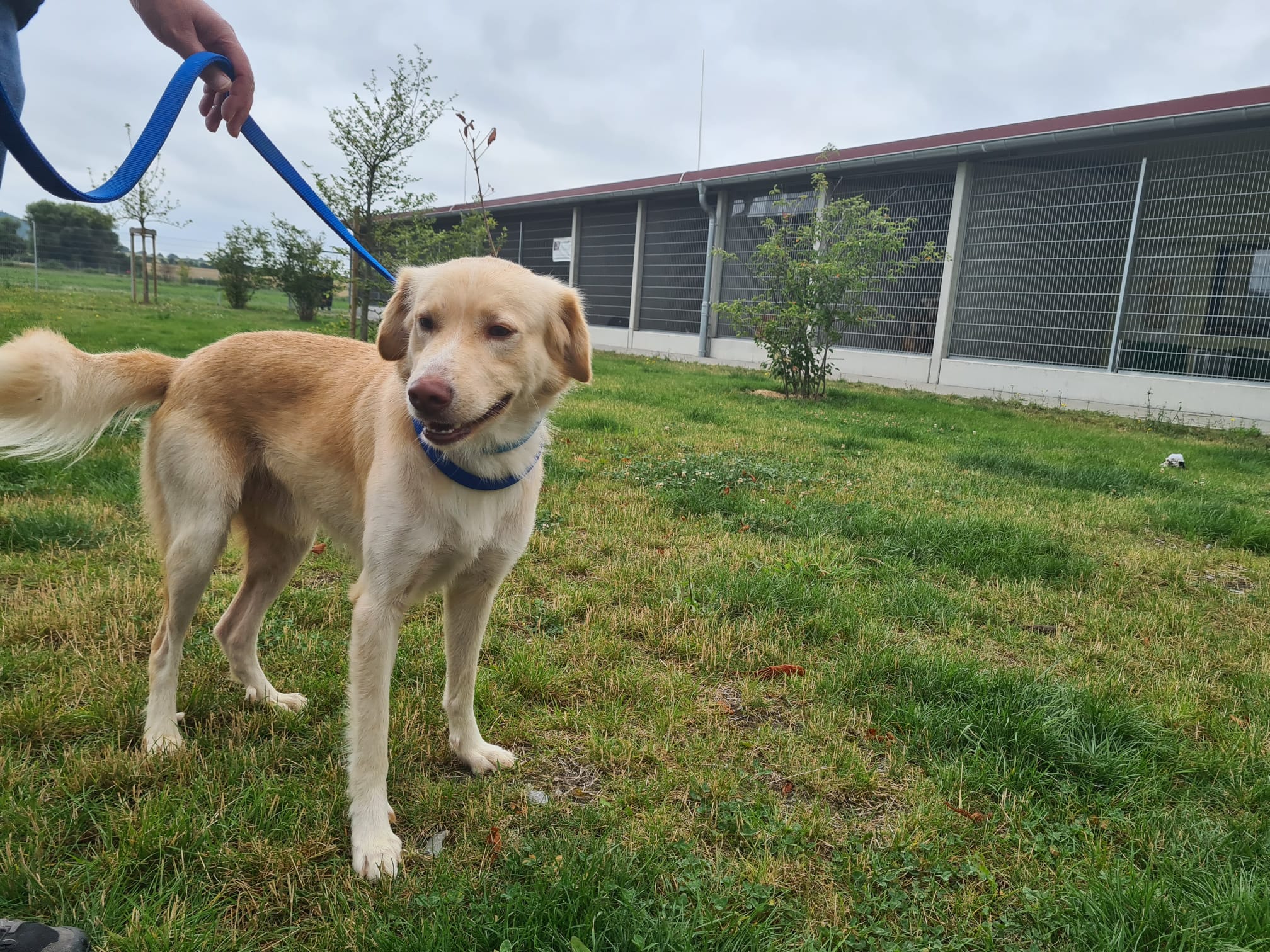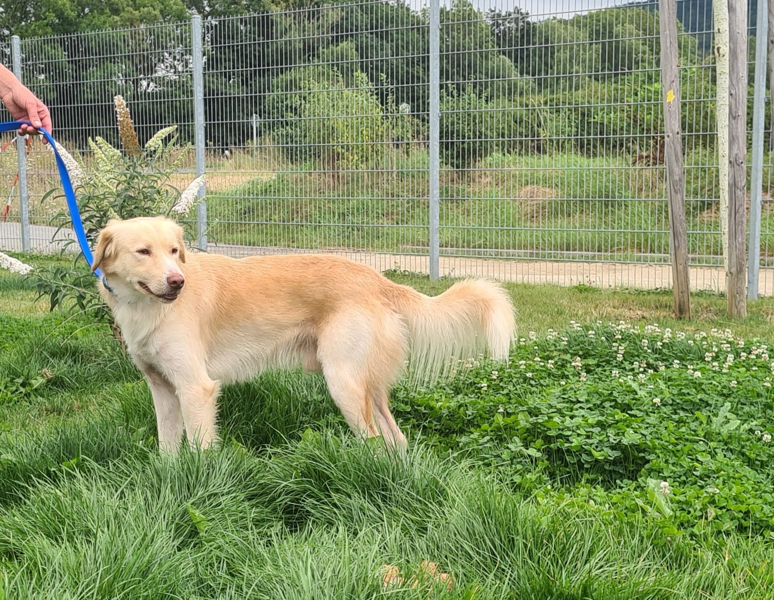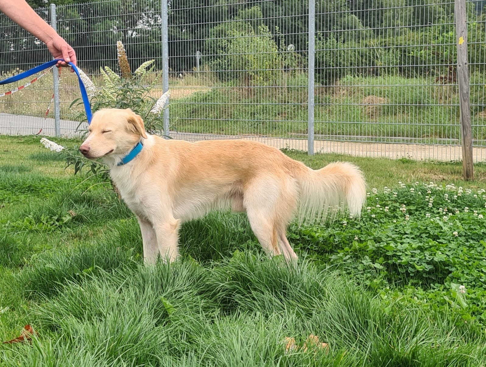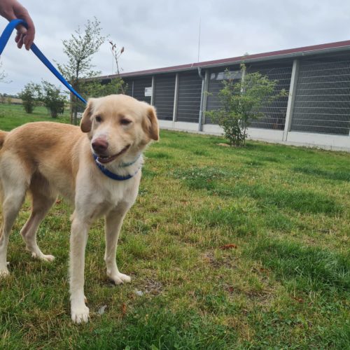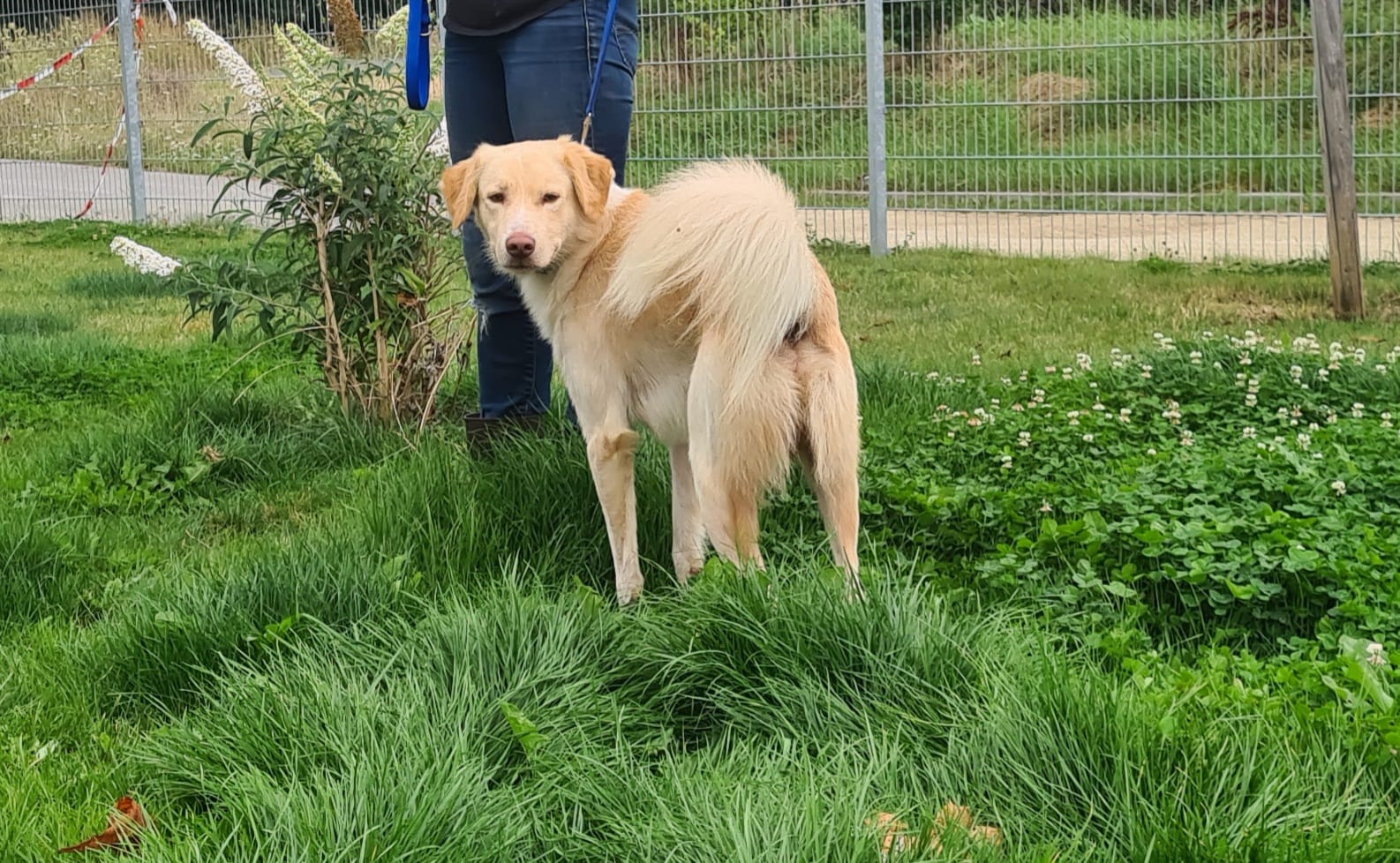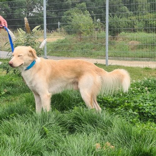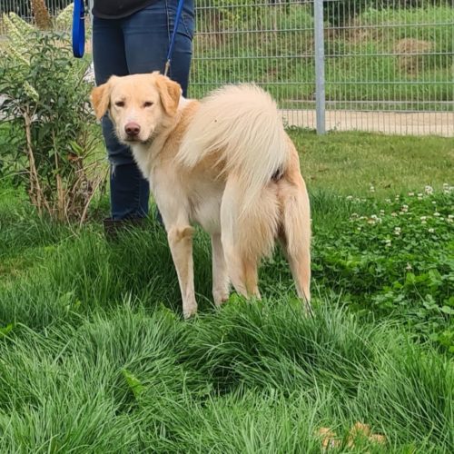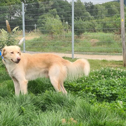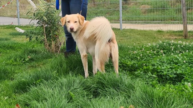 Blomi ist ca. zwei Jahre alt. Da er bislang noch keine Erziehung genossen hat, wäre eine Hundeschule sinnvoll.