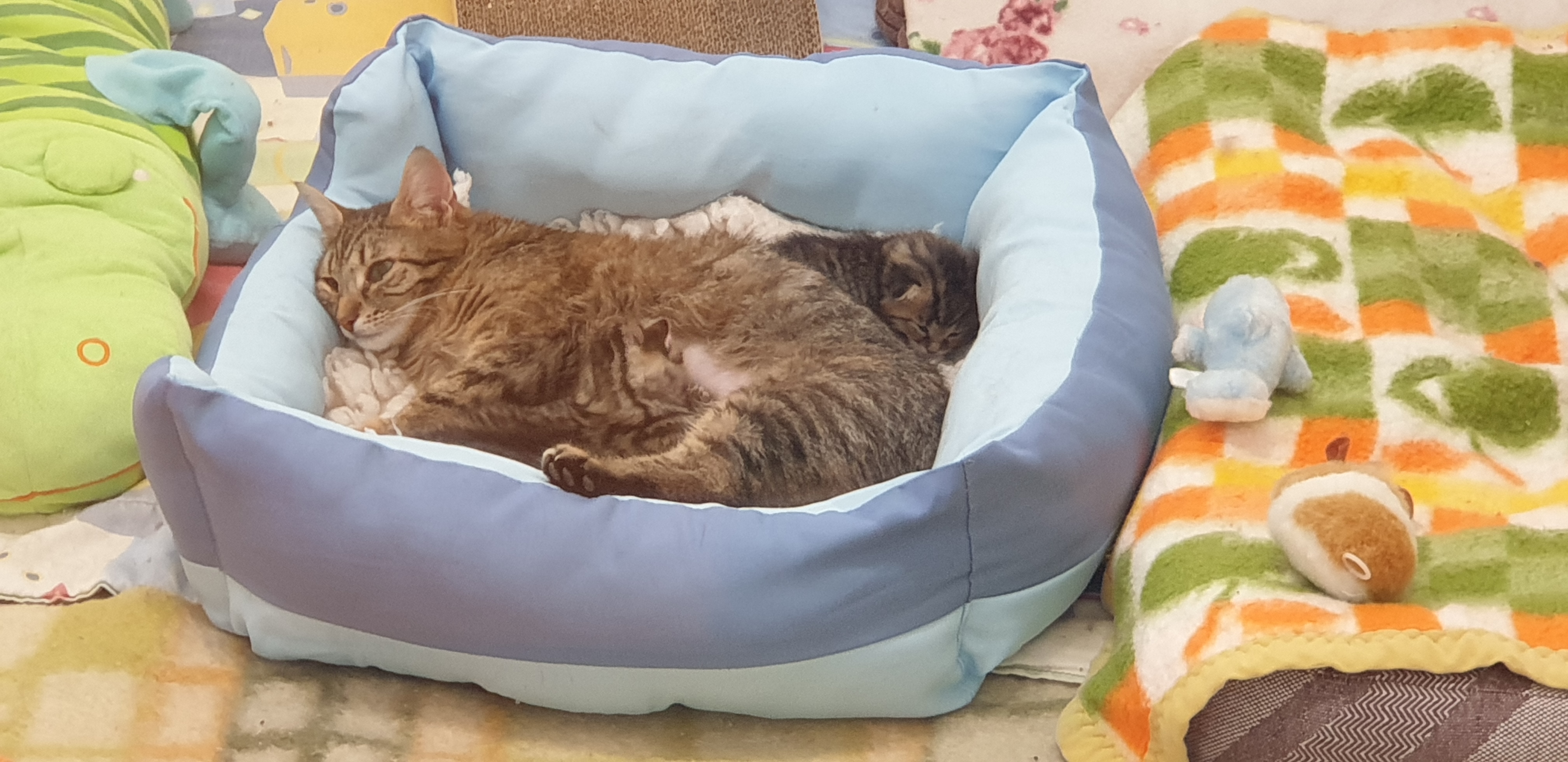 Obwohl sie selbst noch in der Regenerationsphase ist, kümmert sie sich liebevoll um Ihre Babys.