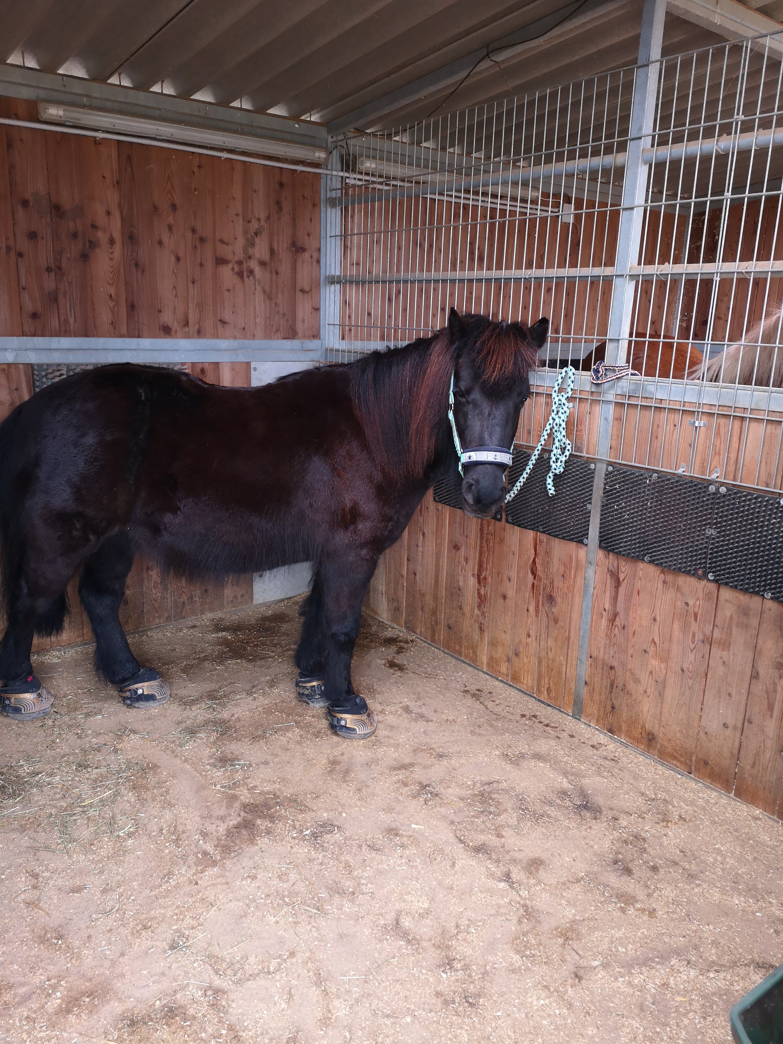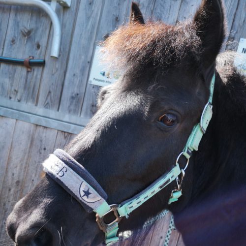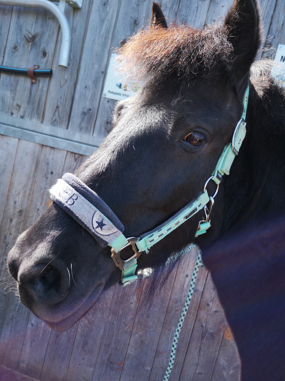 Flicka ist extrem verschmust und kinderlieb, Hunde mag sie auch, Sattel kennt sie nicht, Trense und Voltigiergurt schon, sie liebt es Reißverschlüsse und Klettverschlüsse auf und zu zu machen, sie ist ruhig und unerschrocken aber kann auch Temperament haben, sie bräuchte Spielkameraden oder Kinder die mit ihr was machen, sie ist kerngesund.