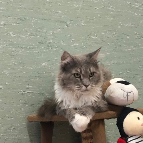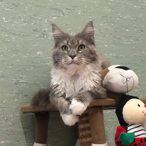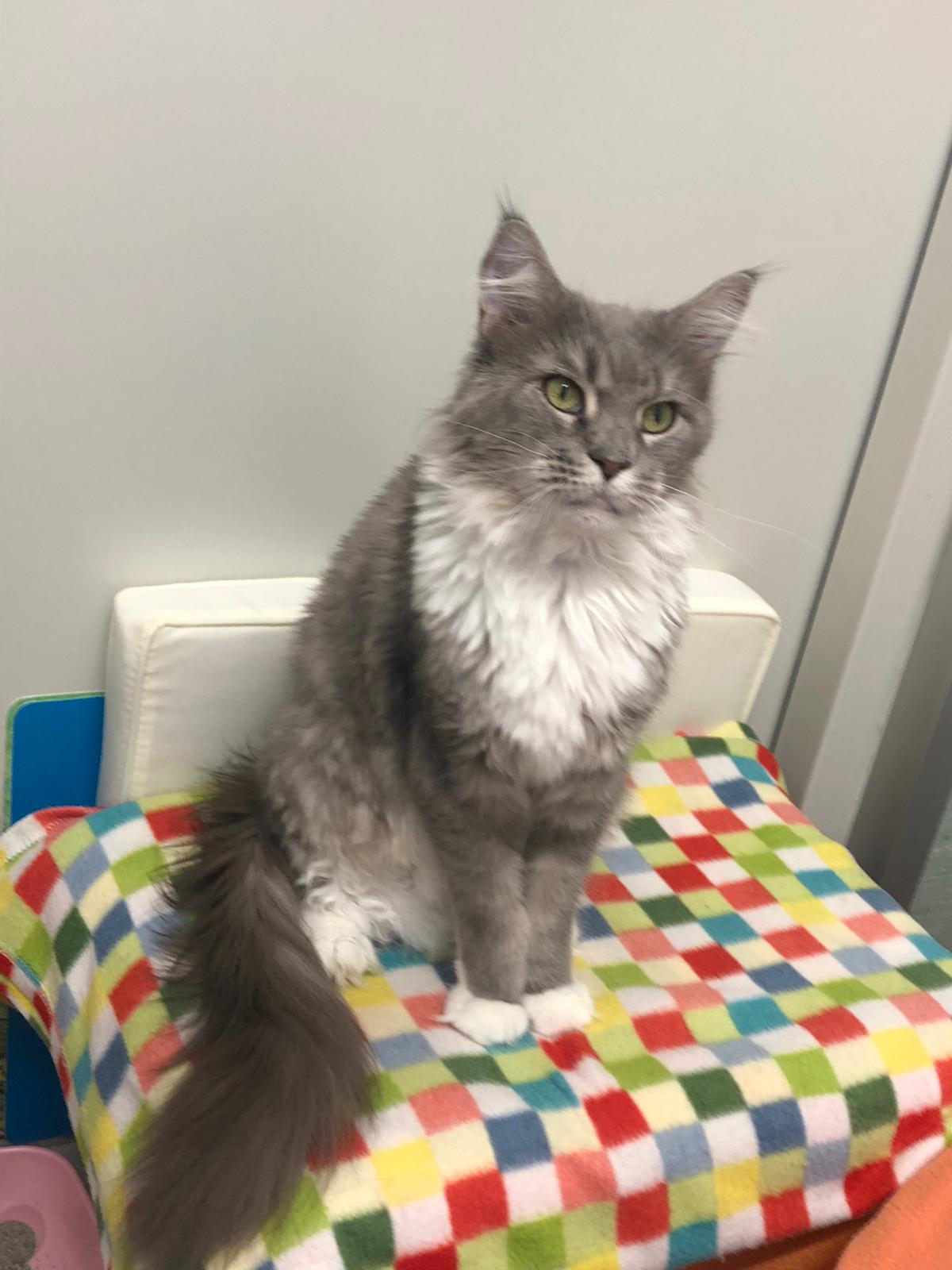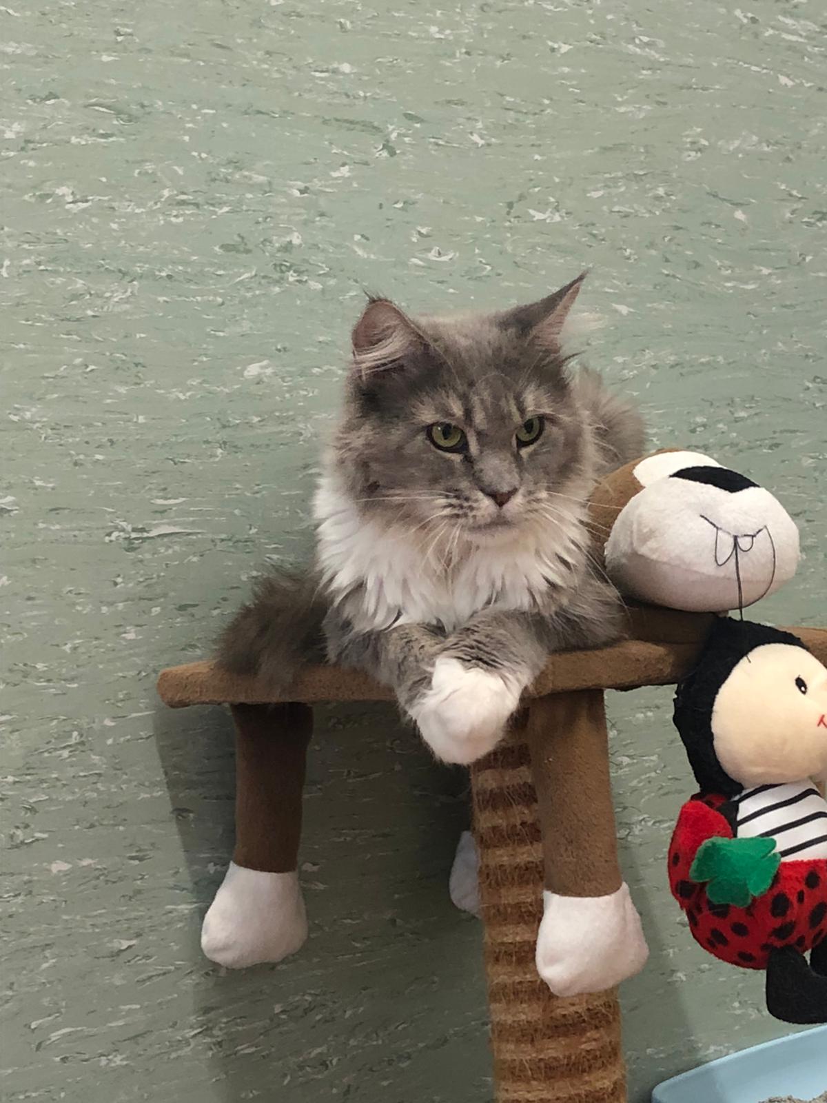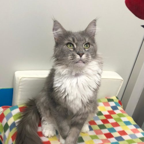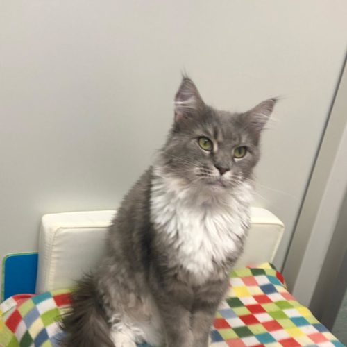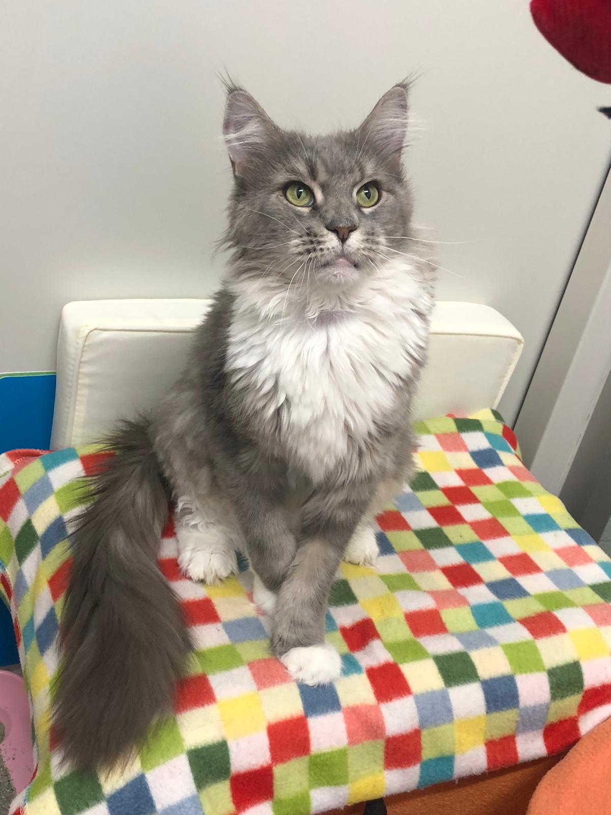Die tapfere Luxi ist hochschwanger und viel zu dünn mit den anderen 40 Maine Coons zu uns gekommen.