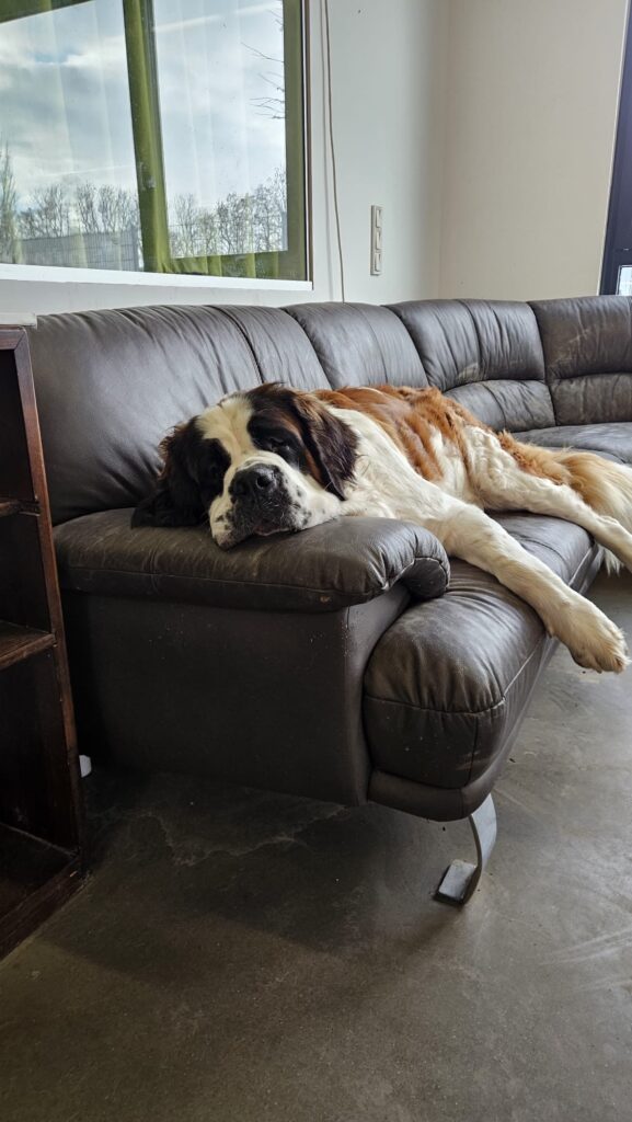 Rassebedingt wurde ich natürlich auf Krankheiten untersucht und bin vollständig gesund – auch meine Hüfte ist in Ordnung. Auch im Büro der Tierheimleitung habe ich mich als ein toller Bürohund gezeigt: Wenn die Chefin am PC sitzt, liege ich brav neben dem Bürostuhl und schlummere langsam ein.