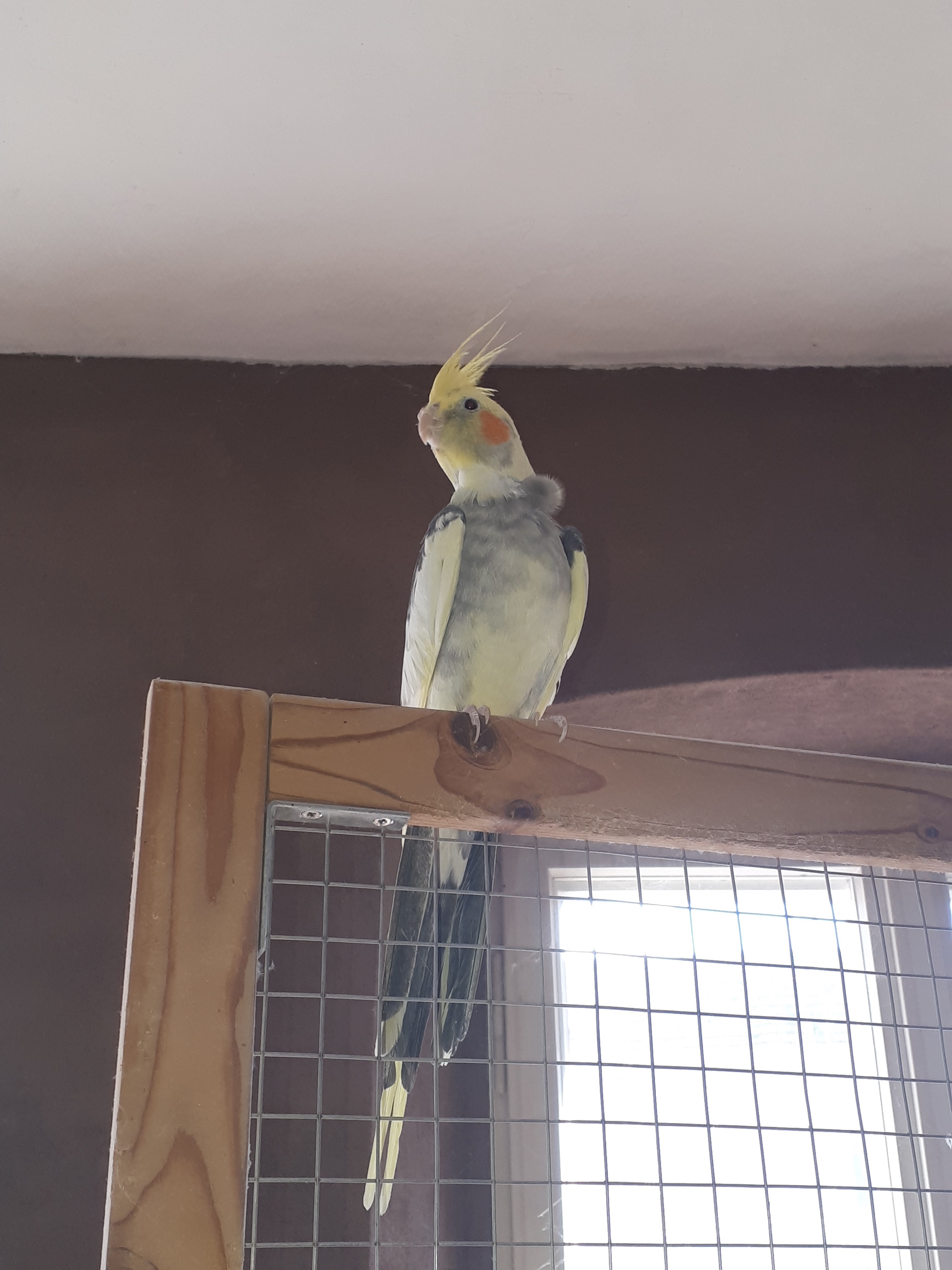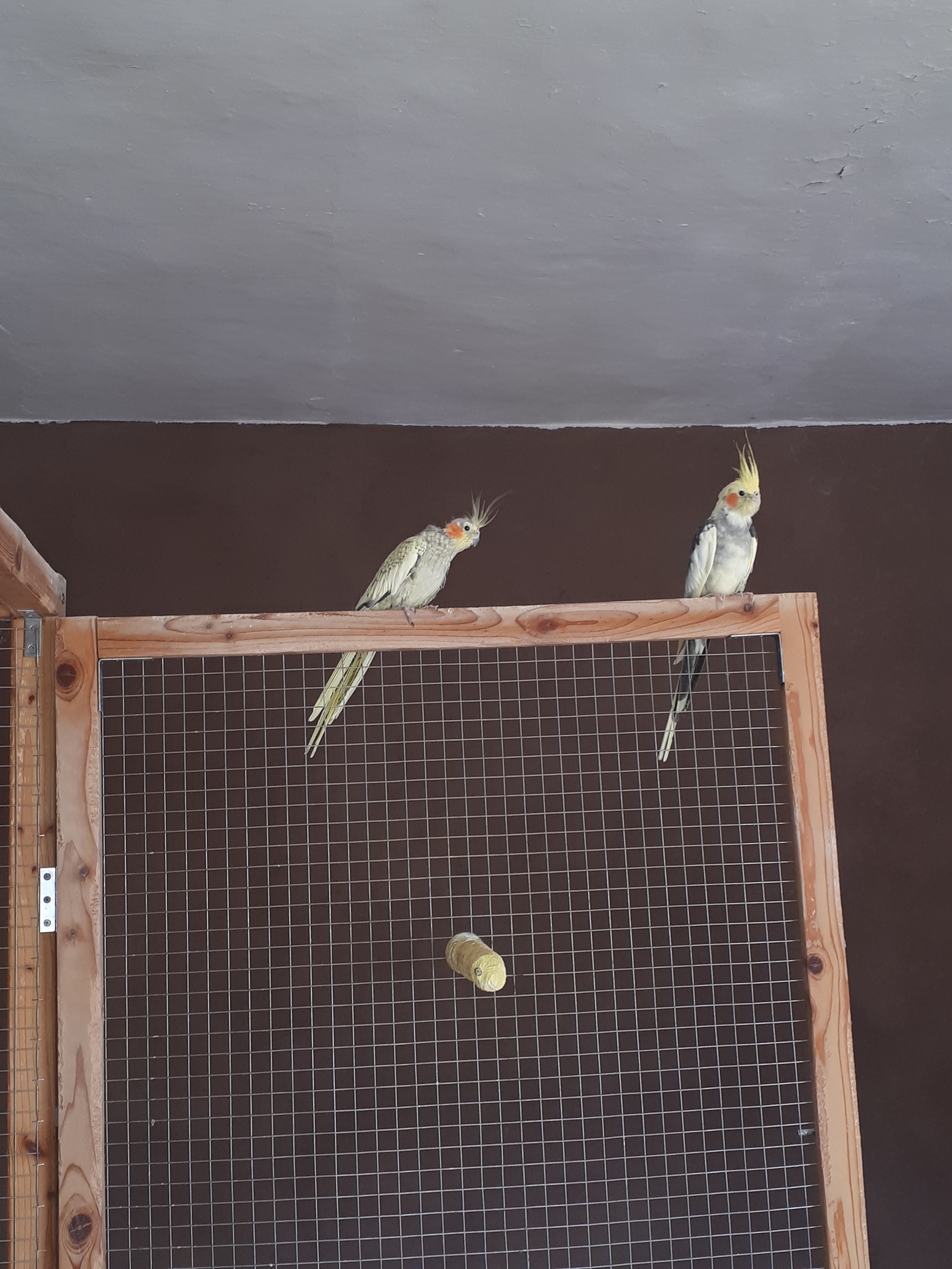 Aktuell ist für Quitschie (das ist der Hahn, gelb gescheckt) und Lulu (das ist die Henne, gelb geperlt) die Voliere immer offen, so dass sie im ganzen Zimmer fliegen können (was sie auch ausgiebig tun). Es war uns immer wichtig, dass sie viel Platz haben. Sie sind die Haltung in einem „normalen“ Käfig nicht gewohnt.