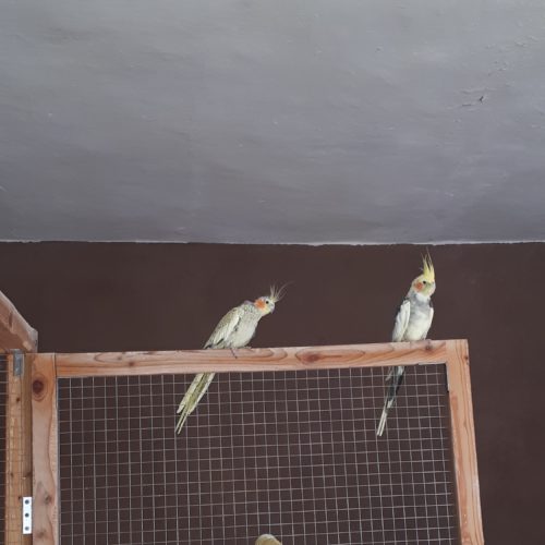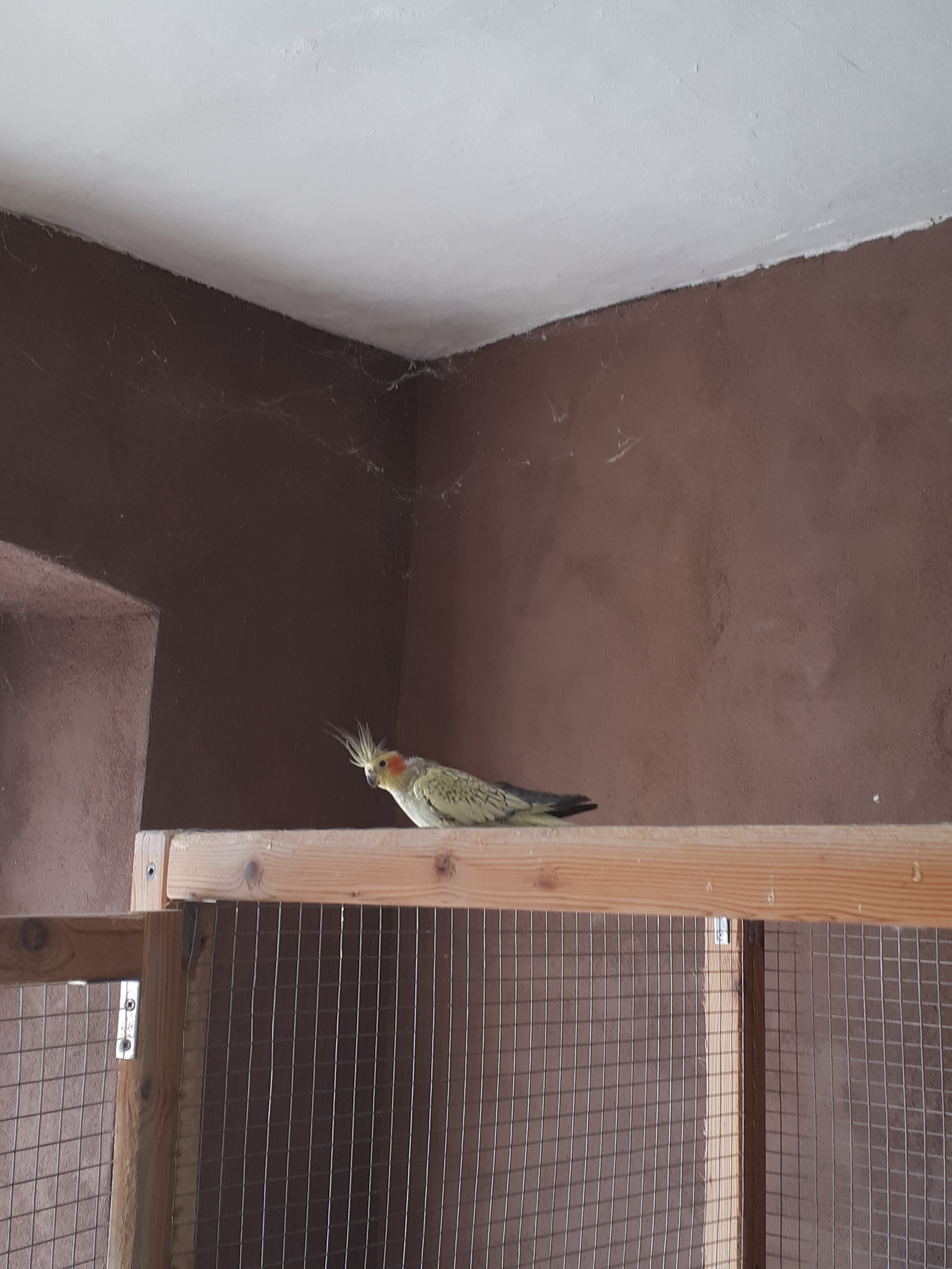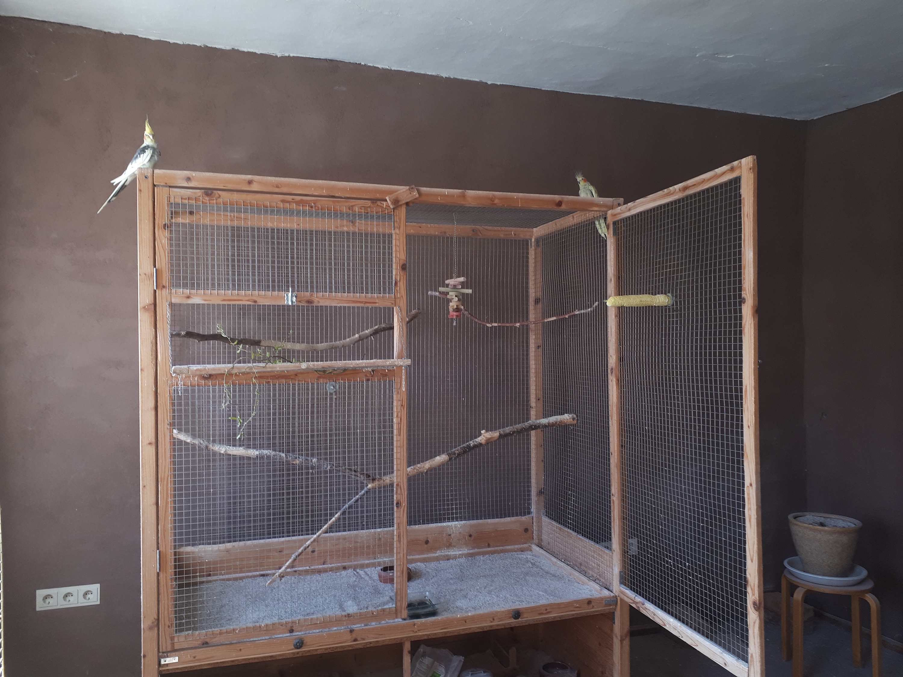 Die Voliere, die zu sehen ist, ist ein Eigenbau und wir würden diese auch durchaus mit abgeben, wenn es gewünscht ist. Sie ist geschraubt und muss nicht in einem Stück transportiert werden.