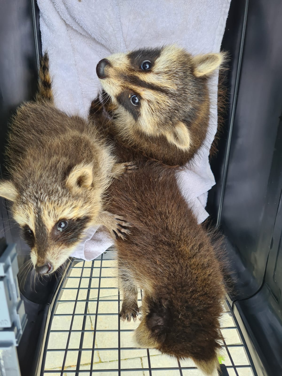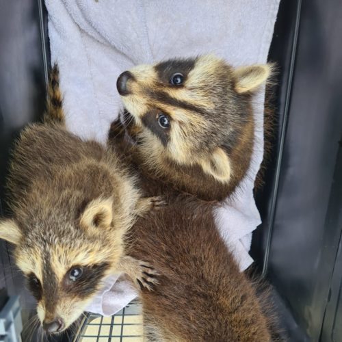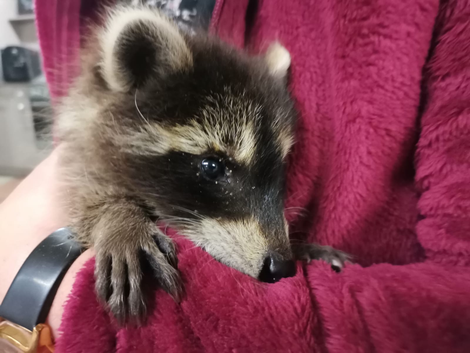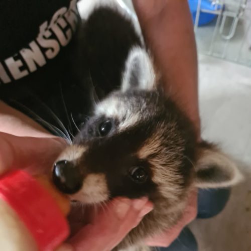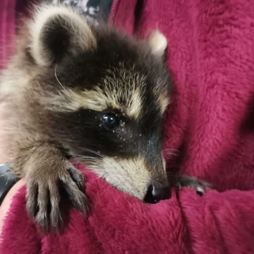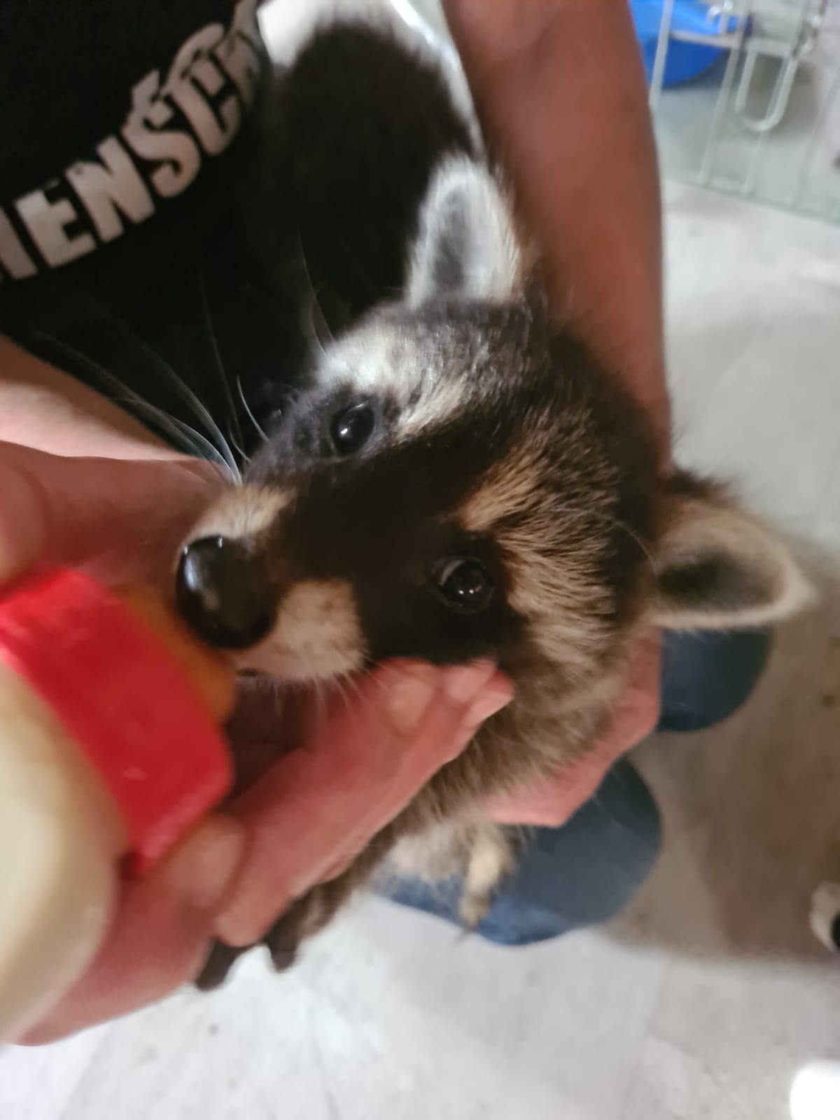 drei Waschbärbabys (eines auf der Bundesstraße gefunden – es lag noch neben den überfahrenen Geschwister und der Mutter; eines von Polizei Ebern fürsorglich gebracht, eines wurde von befreundeten Tierschützern übernommen),